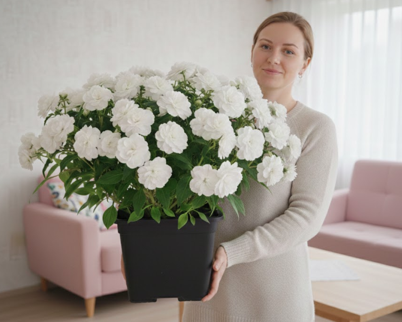 Кімнатний махровий бальзамін «Навруз» — це вдале поєднання швидкого розвитку, рясного цвітіння та зручного формату вирощування. Насіння вже висаджене у горщик П9, тому рослина від самого початку отримує правильні умови для формування сильної кореневої системи та стабільного росту.