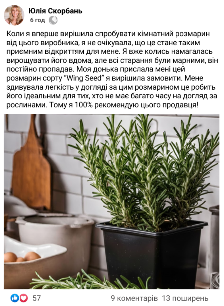 Кімнатний розмарин "Wing Seed" - це багаторічний вічнозелений кущик висотою 30-50 см. Вузьке листя довжиною 3 – 4 см, з лицьового боку – глянсове, і виворот – злегка опушене. Насіння вже висаджене у горщик П9 та адаптоване на 100% до кімнатних умов. Не вимагає особливого догляду: тільки регулярний полив та обрізання стебла за необхідності. Використовують свіжим